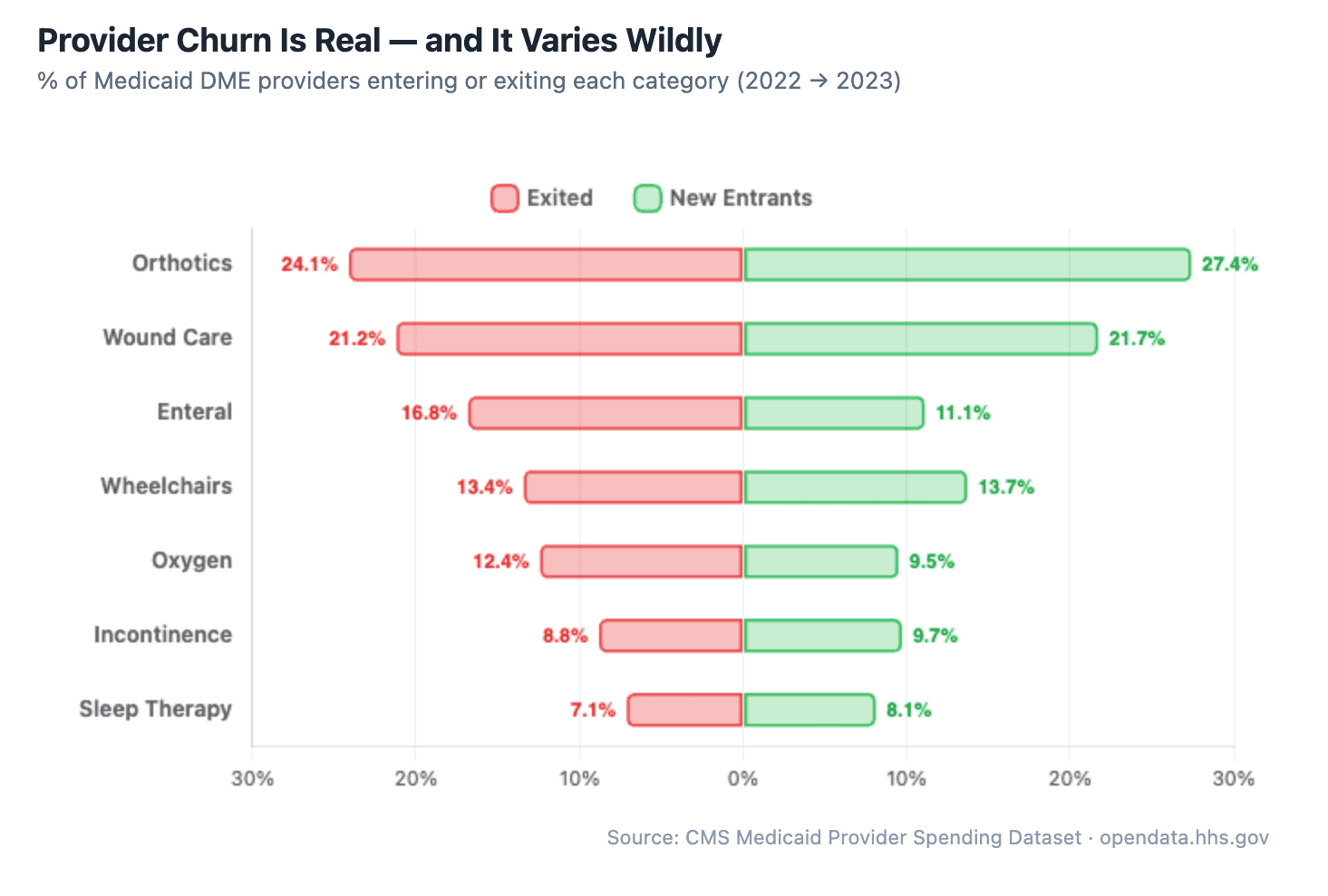 Every year, a meaningful number of providers enter and exit Medicaid DME billing — but the rate varies dramatically by category.