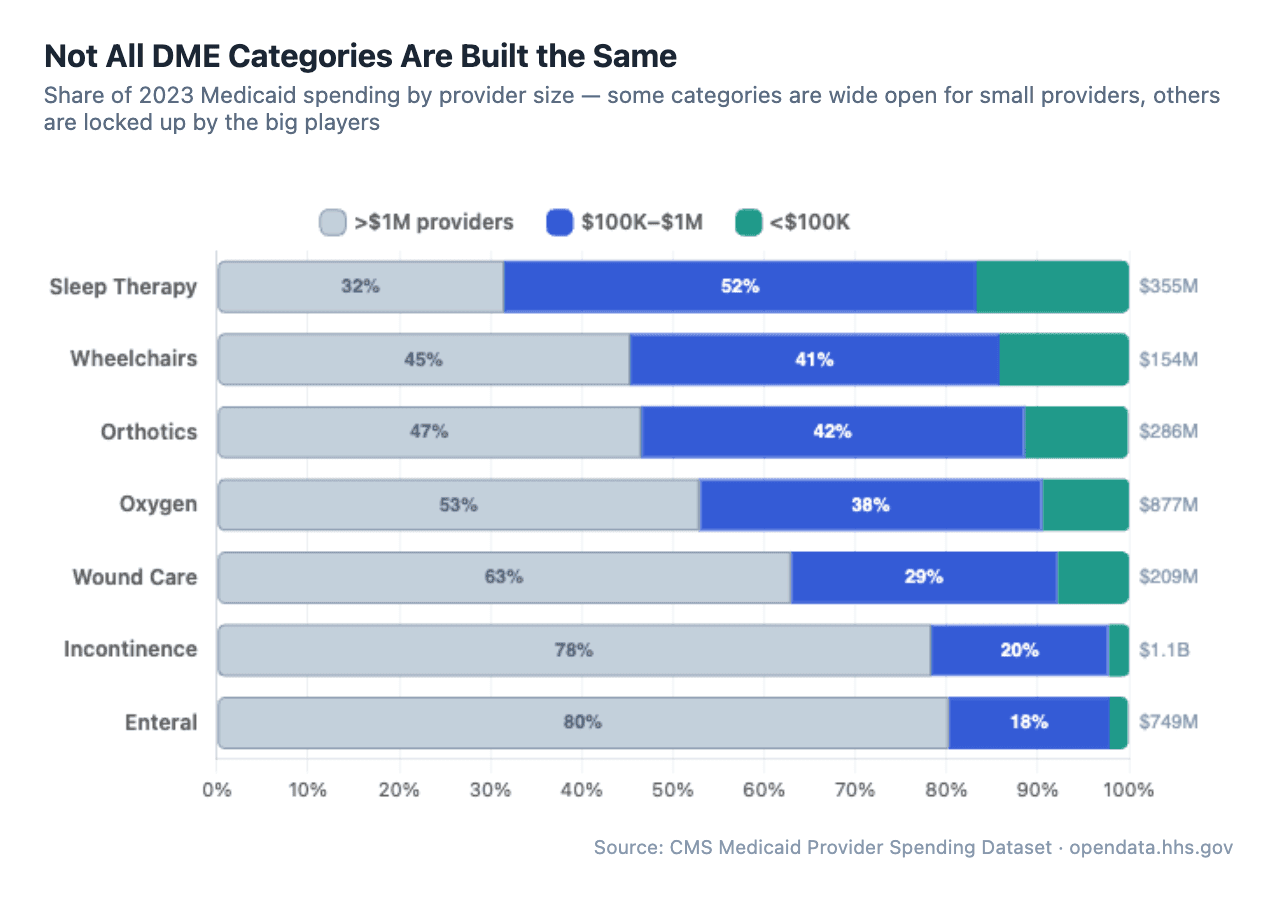 But the opportunity isn't evenly distributed. When we looked at how spending breaks down by provider size across all 8 categories, the differences are dramatic. In sleep therapy, providers billing under $1M account for 68% of total Medicaid spending — the category is wide open. Enteral and incontinence are the opposite: the largest providers control 78–80% of the market. If you're a small or mid-size DME provider looking at where to grow your Medicaid business, this is the map.