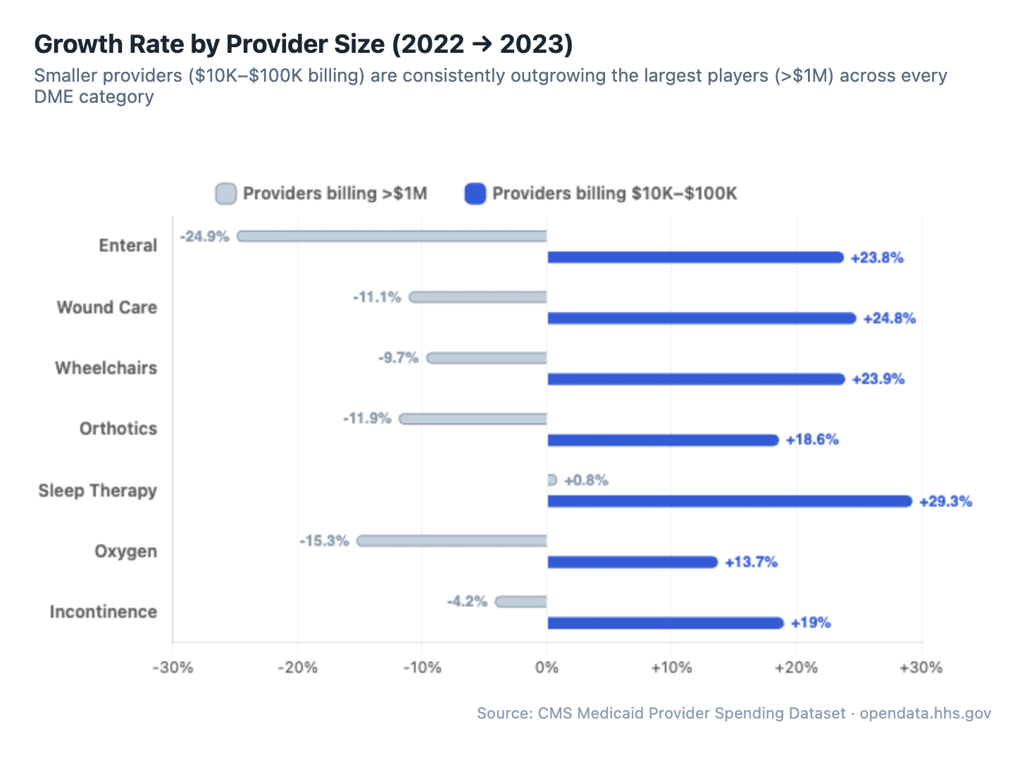 It's not even close. In sleep therapy, providers billing $10K–$100K grew 29.3% while the >$1M providers grew just 0.8%. In wound care and wheelchairs, the largest providers actually shrank while smaller ones grew 20%+. The pattern holds across all 8 categories we analyzed — enteral, orthotics, oxygen, incontinence, all of them.