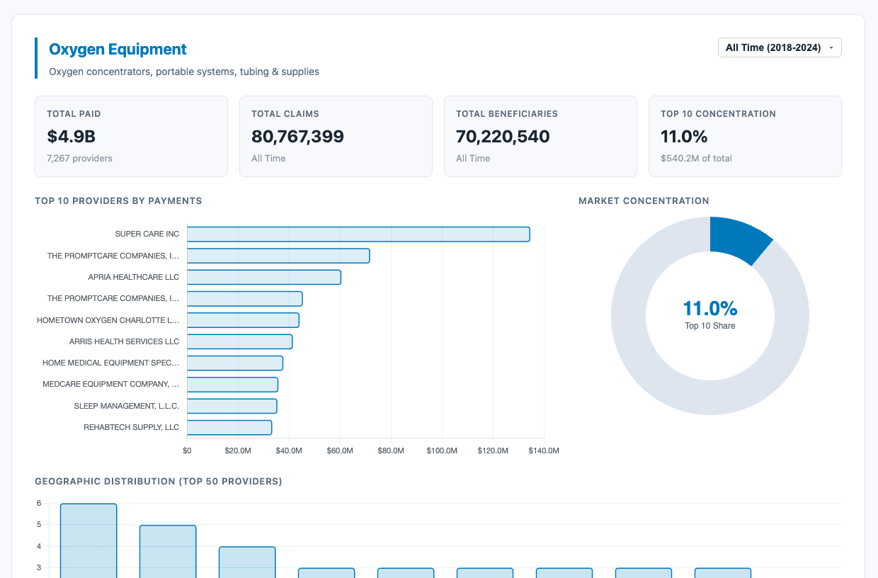We built a free, interactive tool that lets you explore all of this data across 8 DME categories, filter by year (2018–2024), see the top 50 providers in each vertical, and examine market concentration and geographic distribution.